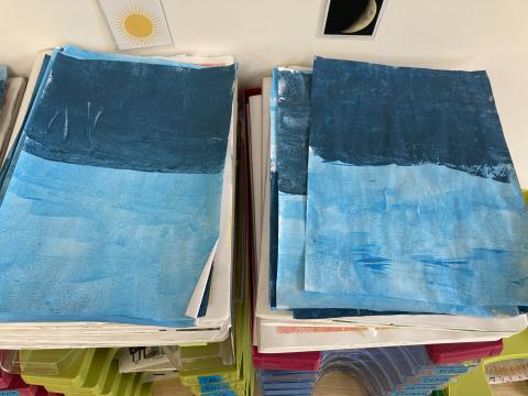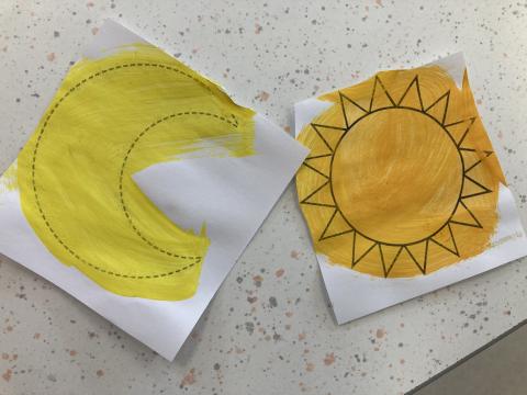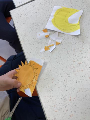 Puis ils ont découpé une "moon" et un "sun" pour continuer leur peinture de ce matin. Résultat final jeudi 16 octobre pour la GRANDE LESSIVE!!