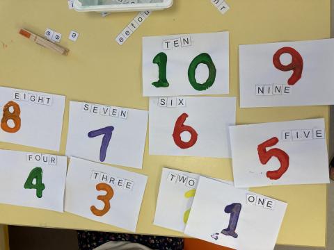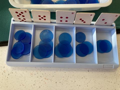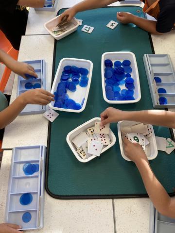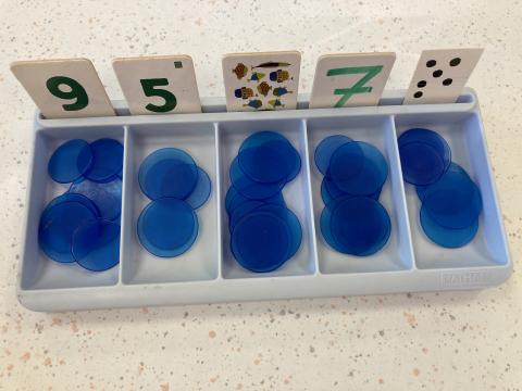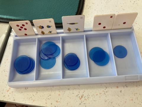 Mathématiques: boites à compter: associer le nombre en chiffres à la bonne quantité ou dénombrer une collection et mettre le bon nombre de jetons (< ou = à 10)
