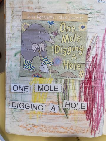 One Mole Digging a Hole: refaire le puzzle de la couverture du livre (8-10 ou 12 pièces selon élève), coller proprement et coller les mots du titre.