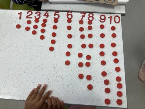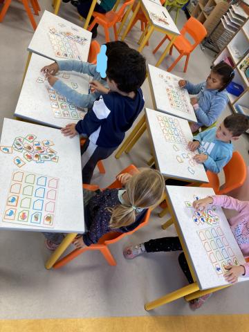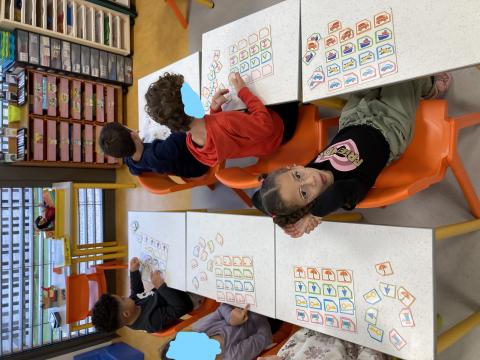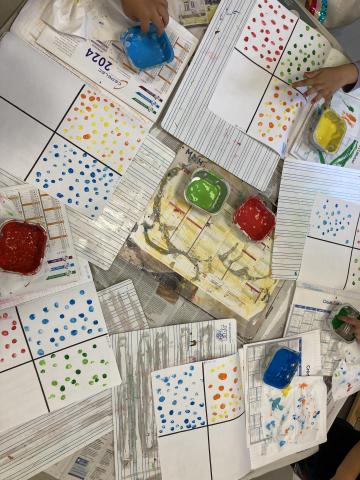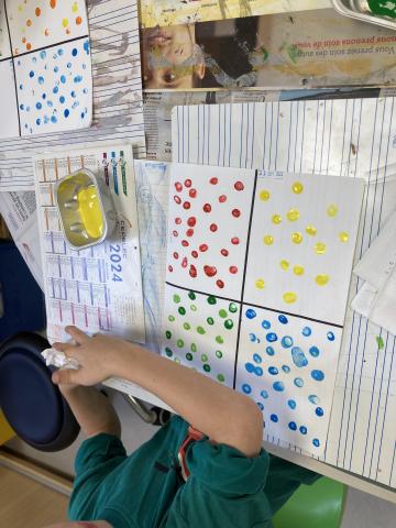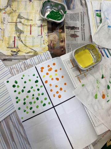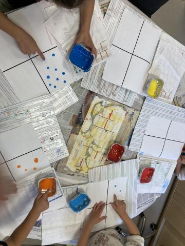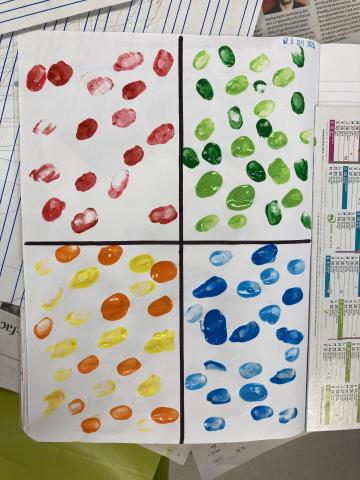Atelier Art: faire les empreintes de doigts avec de la peinture claire et foncée, dans 4 rectangles différents (travail qui sera terminé demain):