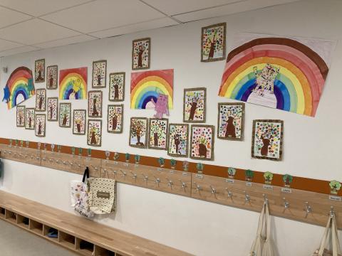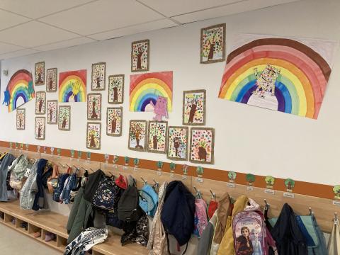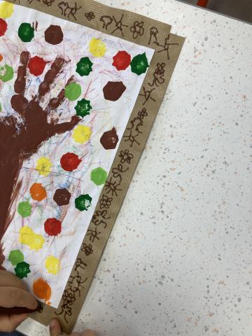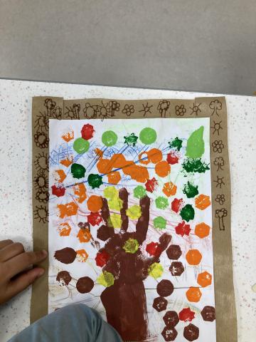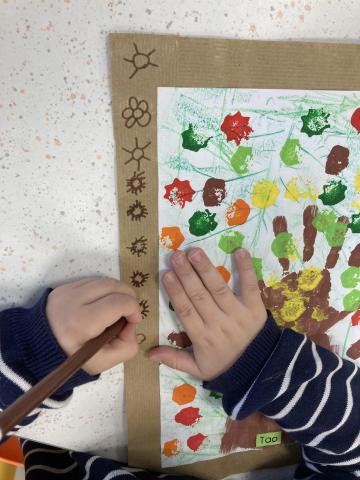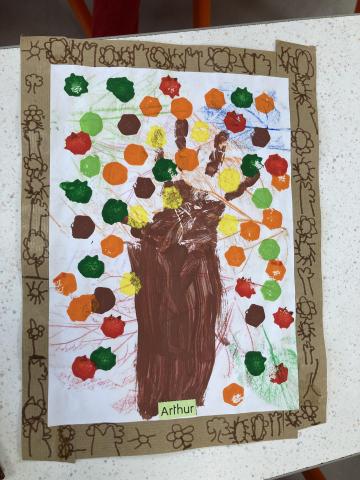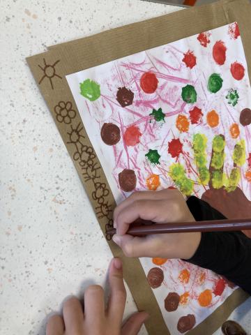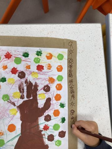 Un atelier graphisme : dessiner des arbres, soleils, fleurs sur le contour en kraft de leur arbre d’automne: