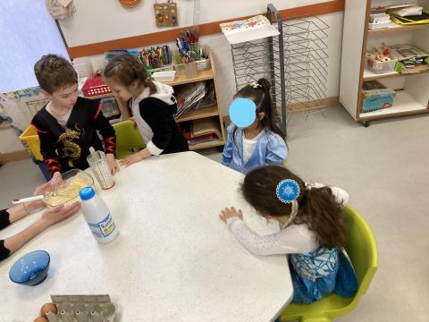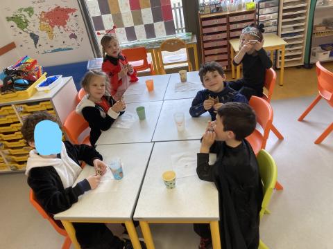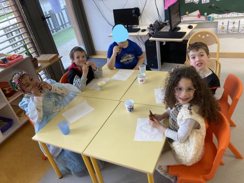 Aujourd'hui, c'était CARNAVAL et nous avons aussi fait de la pâte à crêpes pour fêter les anniversaires de février et début mars. Quelques photos de cette journée festive. D'autres seront dans le cahier de vie.