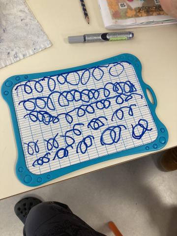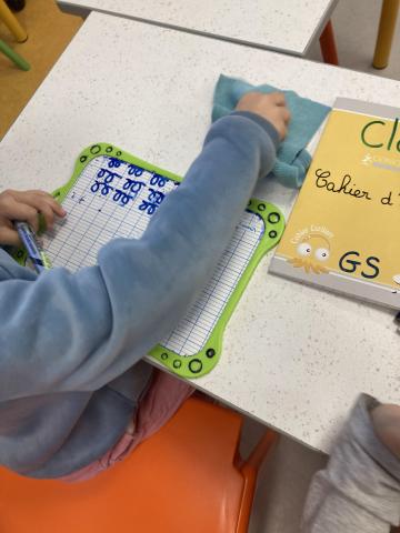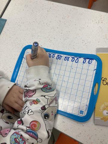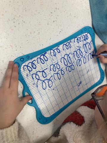 En graphisme, les boucles à l'envers (enchainement de 2 boucles sans s'arrêter) sur l'ardoise et le cahier: