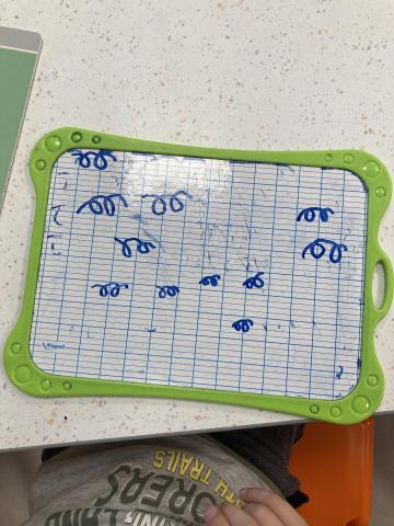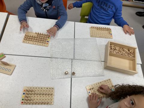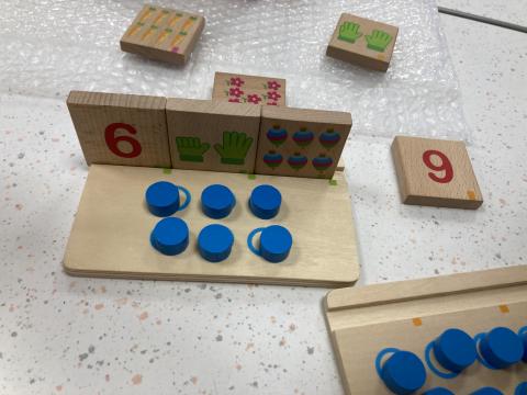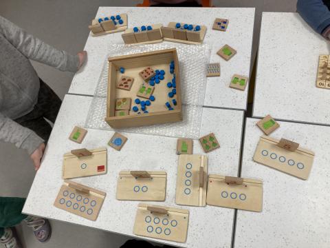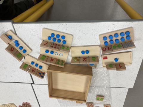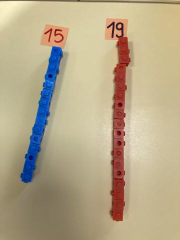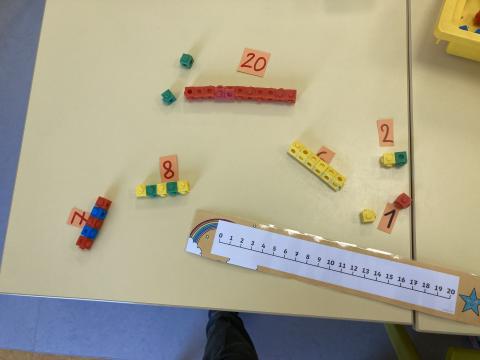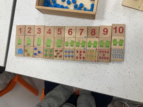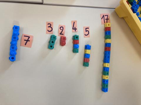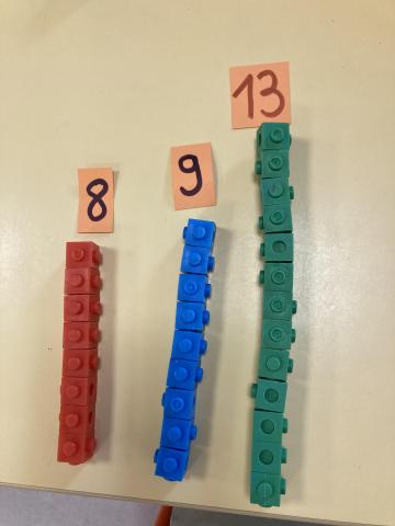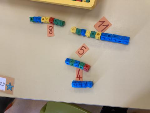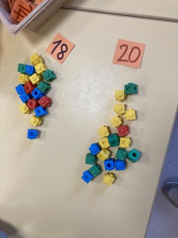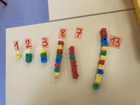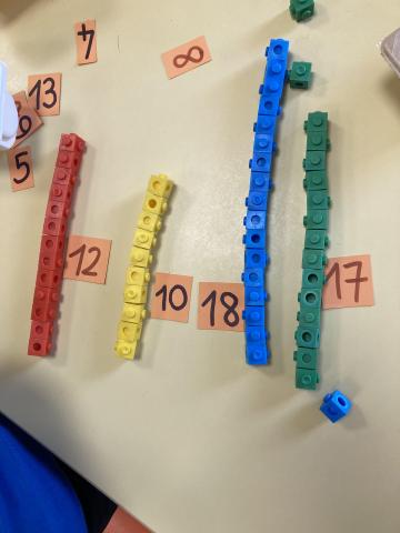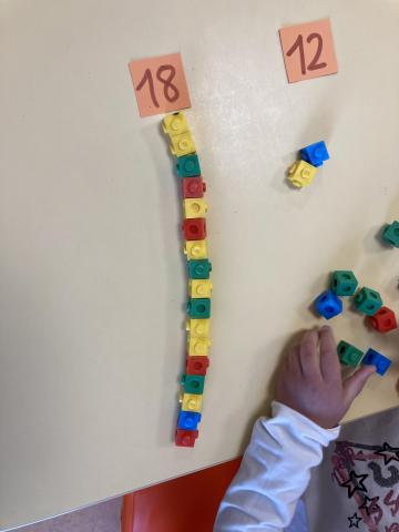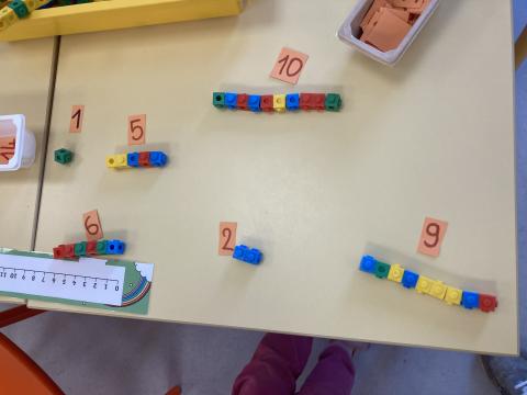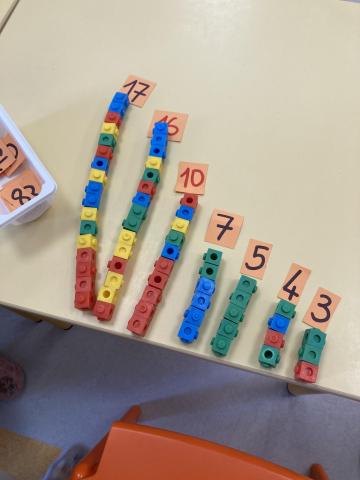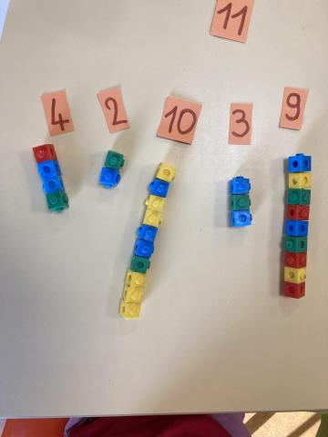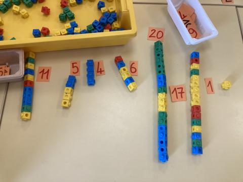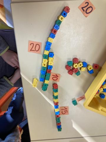 En maths, nous avons construit une collection de cubes équivalente au nombre en chiffres. Nous pouvions nous aider d'un référent pour trouver le nombre (nombres supérieurs à 10):