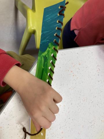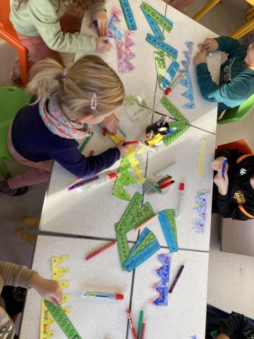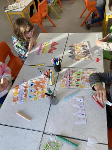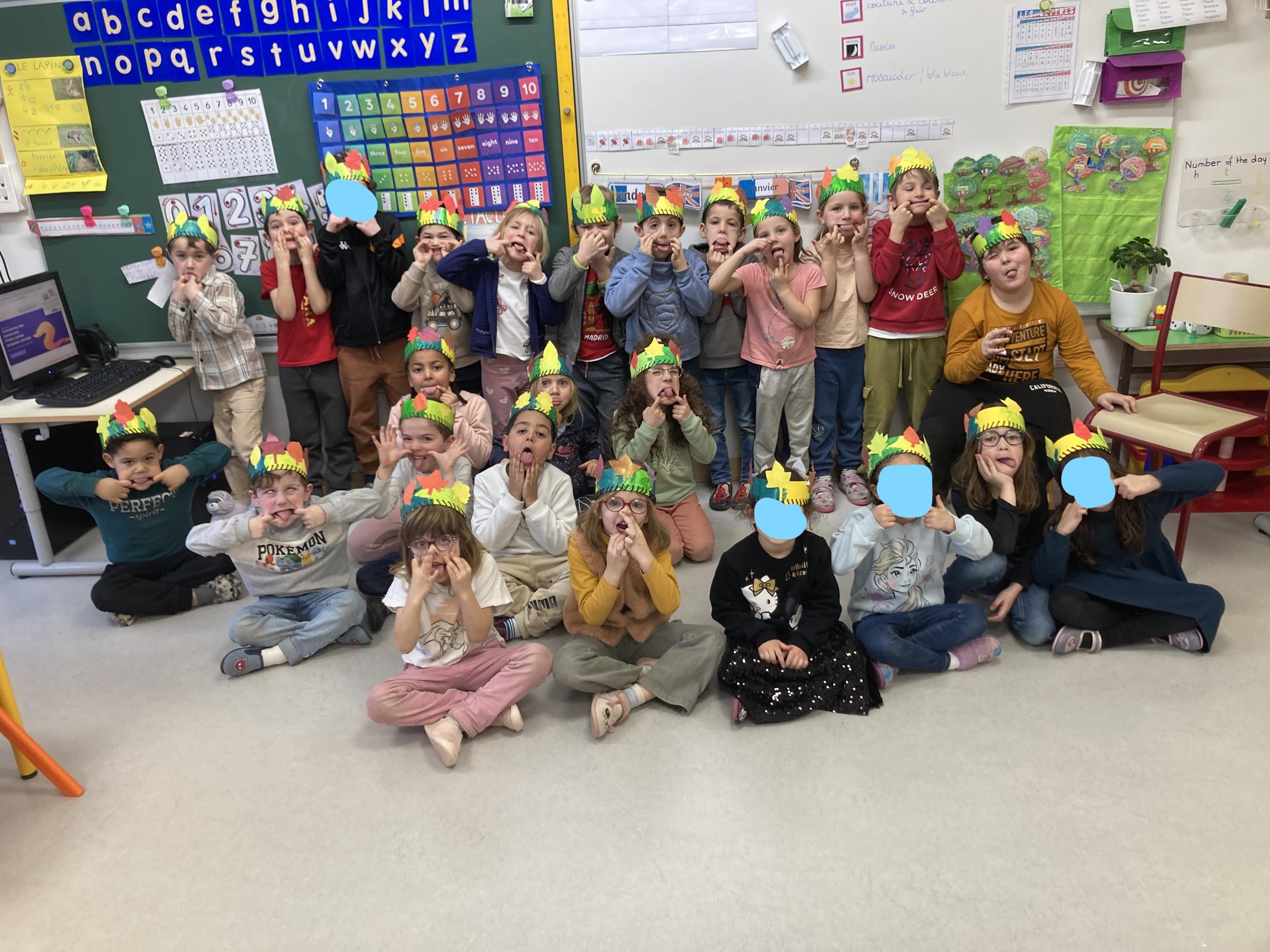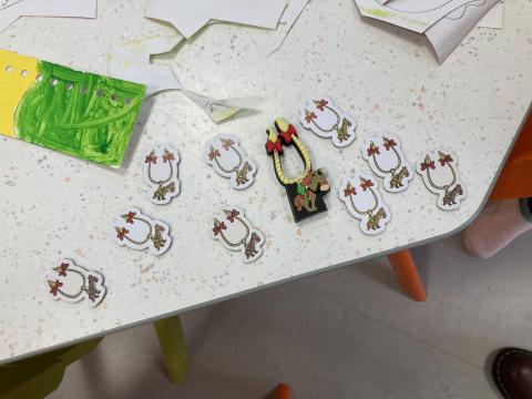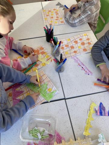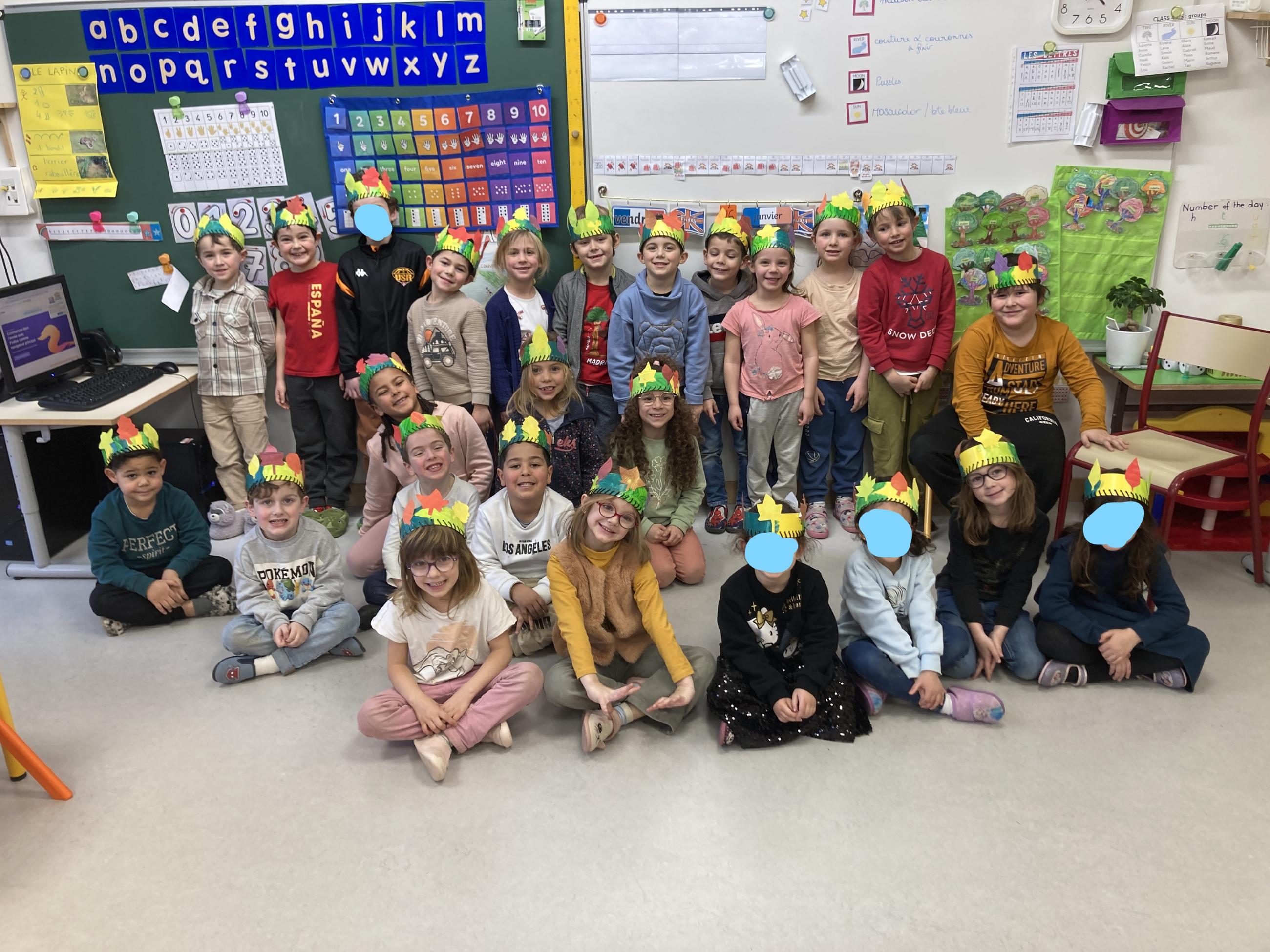 Puis nous avons terminé de décorer nos couronnes en collant les "feuilles d'arbres". Elles sont prêtes pour la semaine prochaine, nous cuisinerons les galettes des rois et fêterons les anniversaires de janvier!