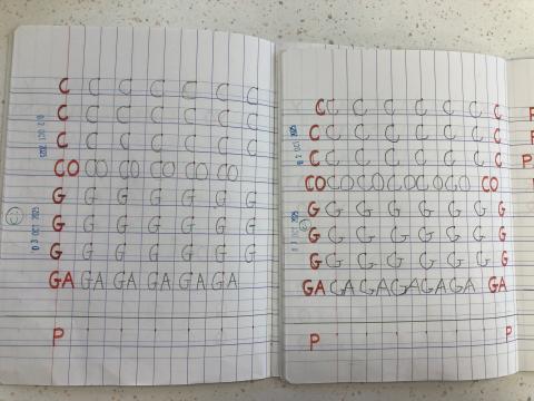 Cet après-midi, nous avons travaillé le "G" et le "GA" (on a lu [G et A], cela fait [GA] dans le cahier d'écriture: