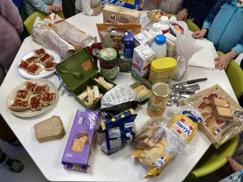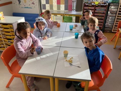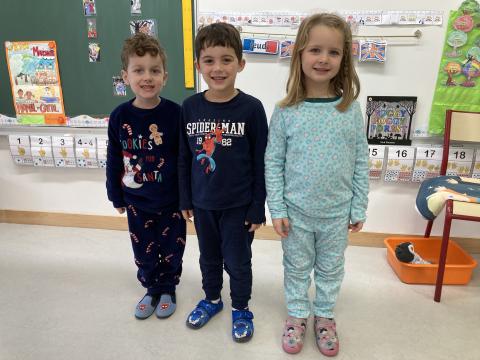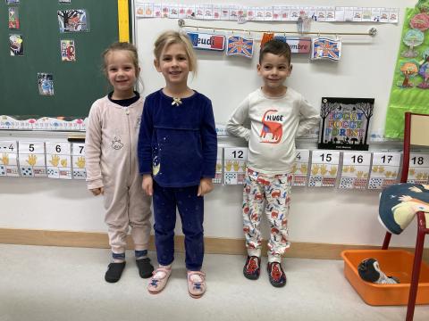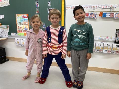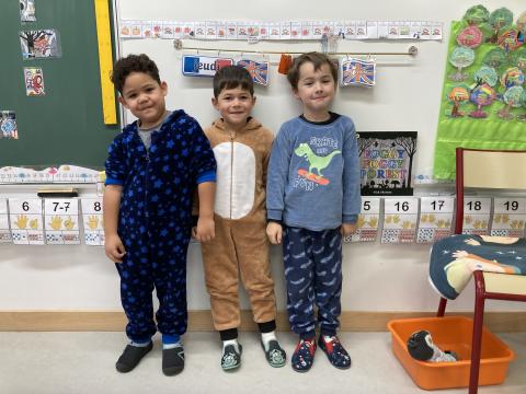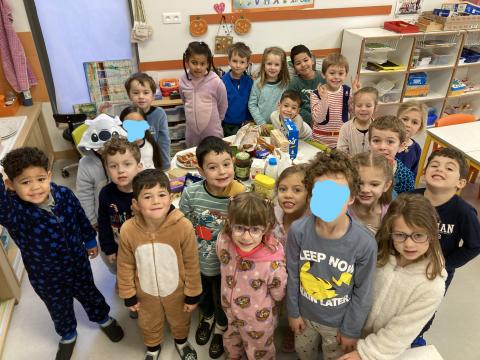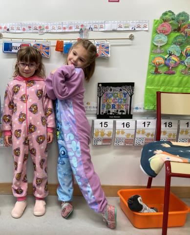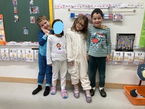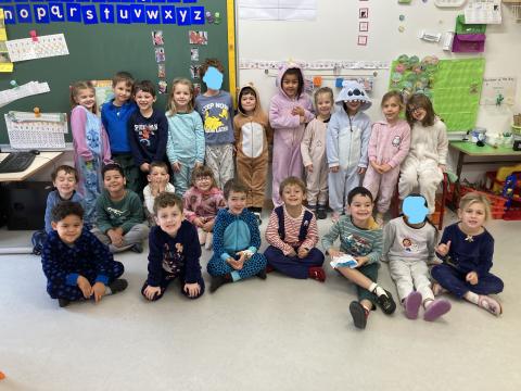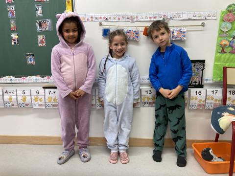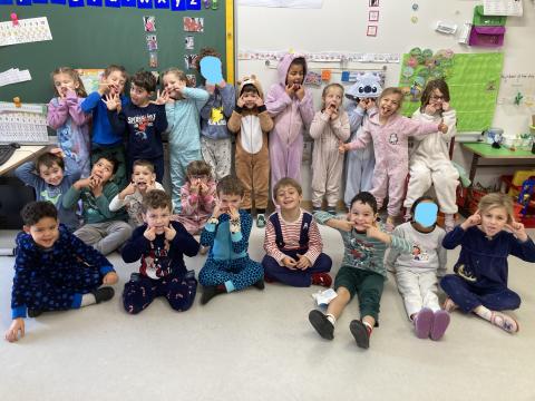 Ce matin, c'était le PYJAMA DAY!! Nous avons regardé tous les aliments apportés, puis nous avons petit déjeuné ensemble. Nous avons faite une séance photos et nous sommes allés en récré. Puis, nous sommes allés à la bibliothèque.