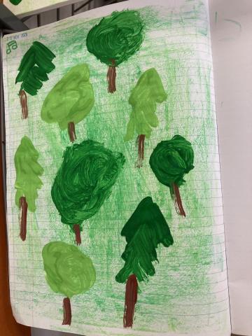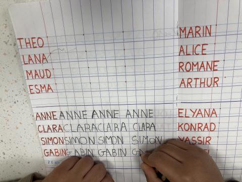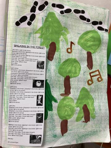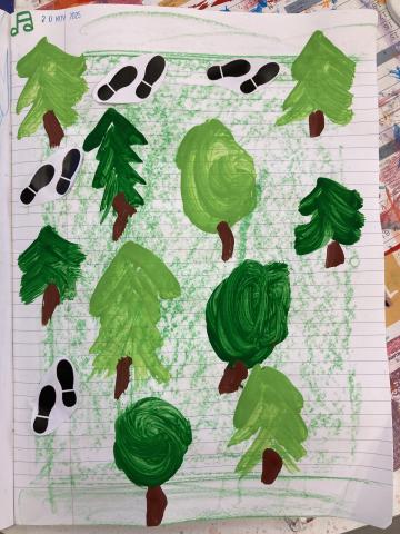 Cet après-midi, écriture dans le cahier, phonologie et poursuite du décor de la chanson WALKING IN THE FOREST dans le cahier de vie: