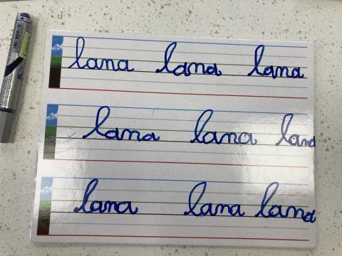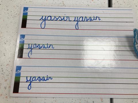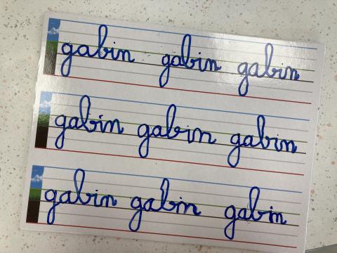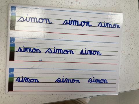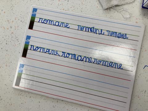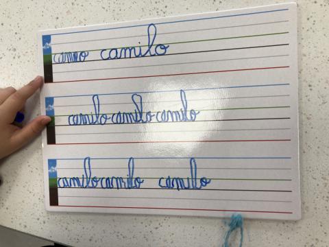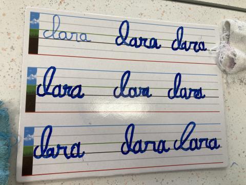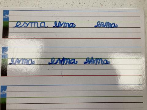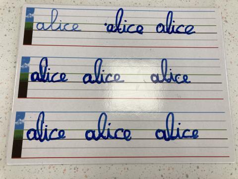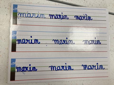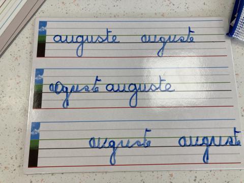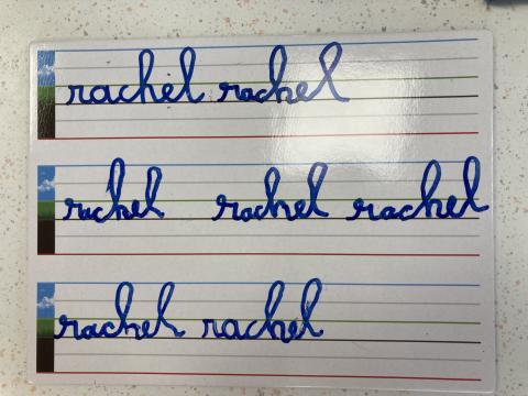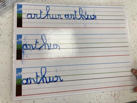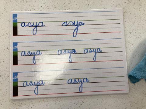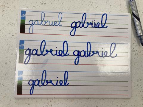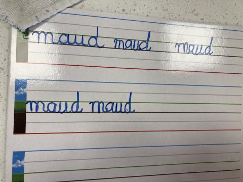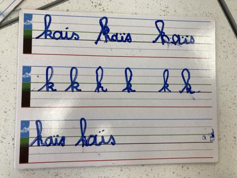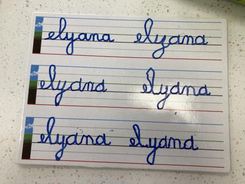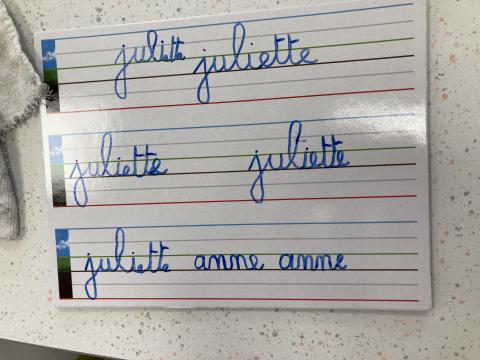Atelier graphisme en attaché du prénom, sur une ardoise lignée: