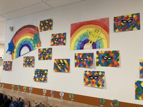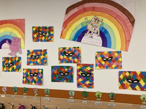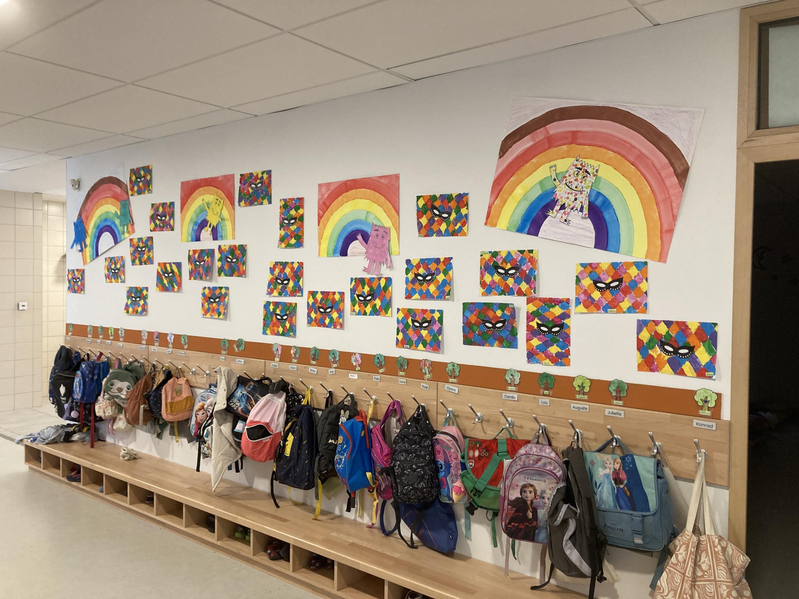 Ce matin, en arrivant, chaque enfant a terminé la décoration de son quadrillage ARLEQUIN débuté la semaine dernière pour afficher les œuvres au mur du couloir: