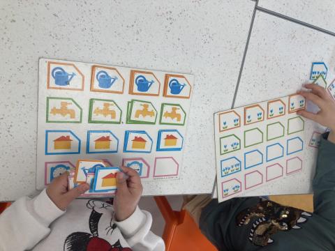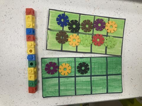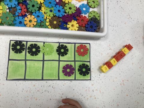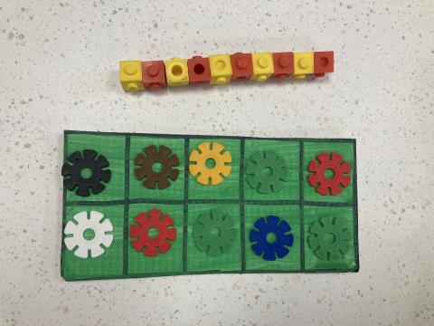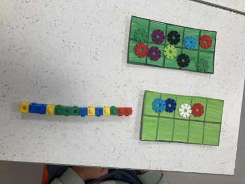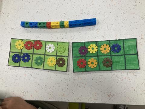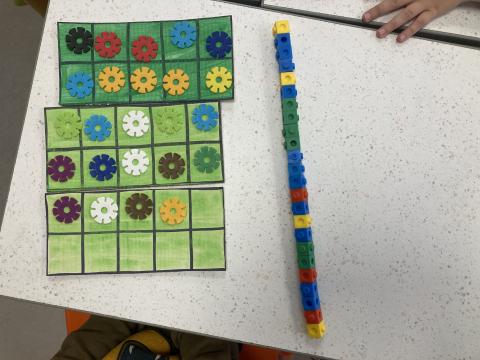 1 en maths où il fallait construire la même quantité de fleurs dans les champs que le nombre de cubes: