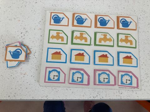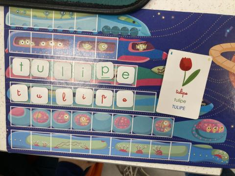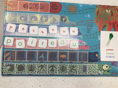 Un atelier en pré-lecture où il fallait reconstituer un mot en script, puis en cursive pour associer ces 2 graphies: